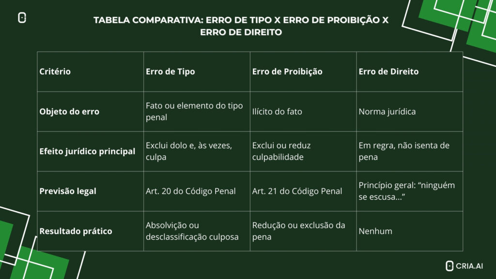 - Tabela comparativa: erro de tipo x erro de proibição x erro de direito