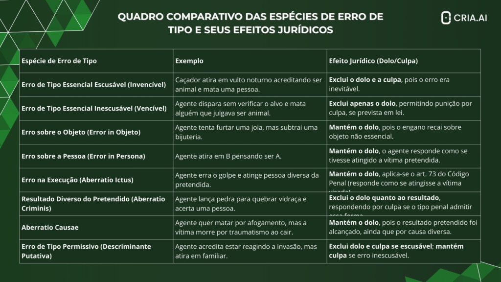 Quadro comparativo das espécies de Erro de Tipo e seus efeitos jurídicos