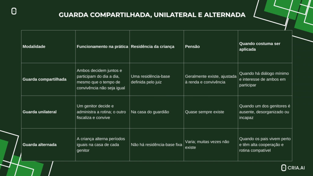 A seguir, uma tabela comparativa sobre Guarda compartilhada, unilateral e alternada, para melhor visualização.