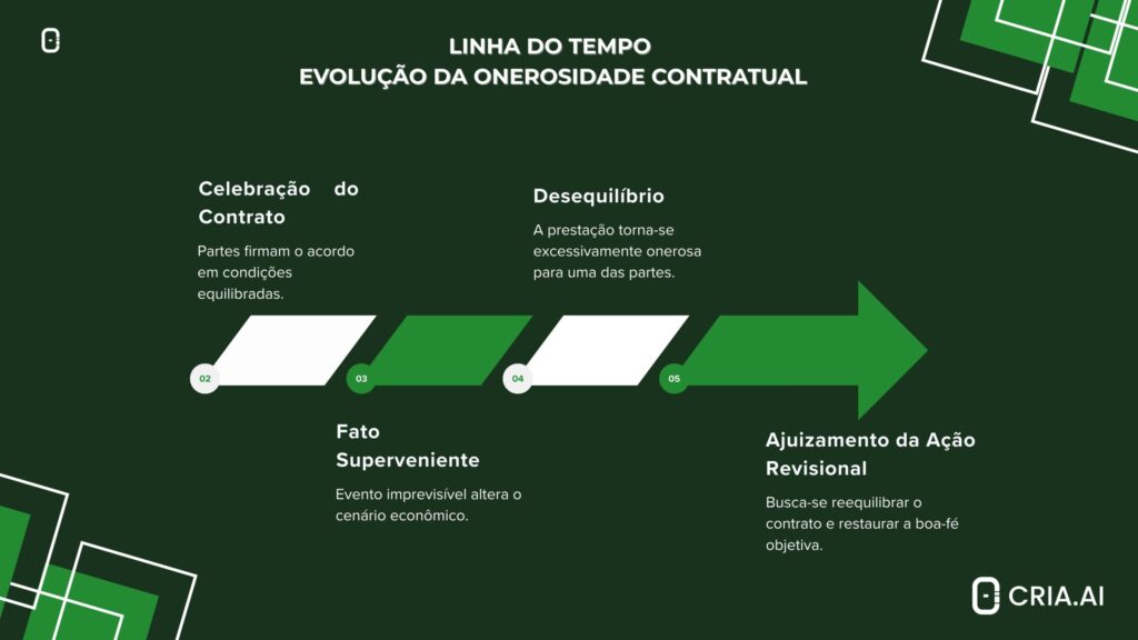 Para visualizar a progressão dos eventos que justificam a revisão contratual, veja a linha do tempo abaixo, que sintetiza o surgimento da onerosidade excessiva e o ajuizamento da ação.