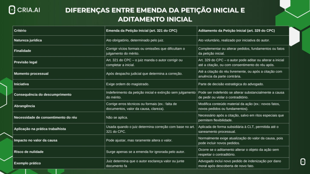 A seguir, veja as principais diferenças entre a emenda e o aditamento da inicial: