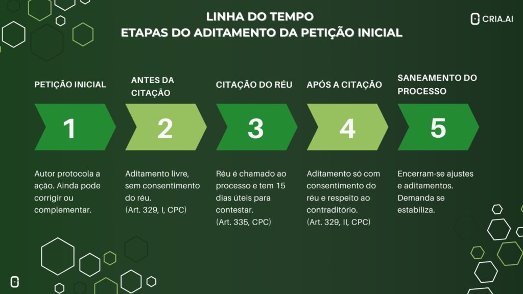 Para visualizar com clareza os momentos processuais em que o Aditamento Inicial é cabível, confira a linha do tempo a seguir, que resume as fases do processo: