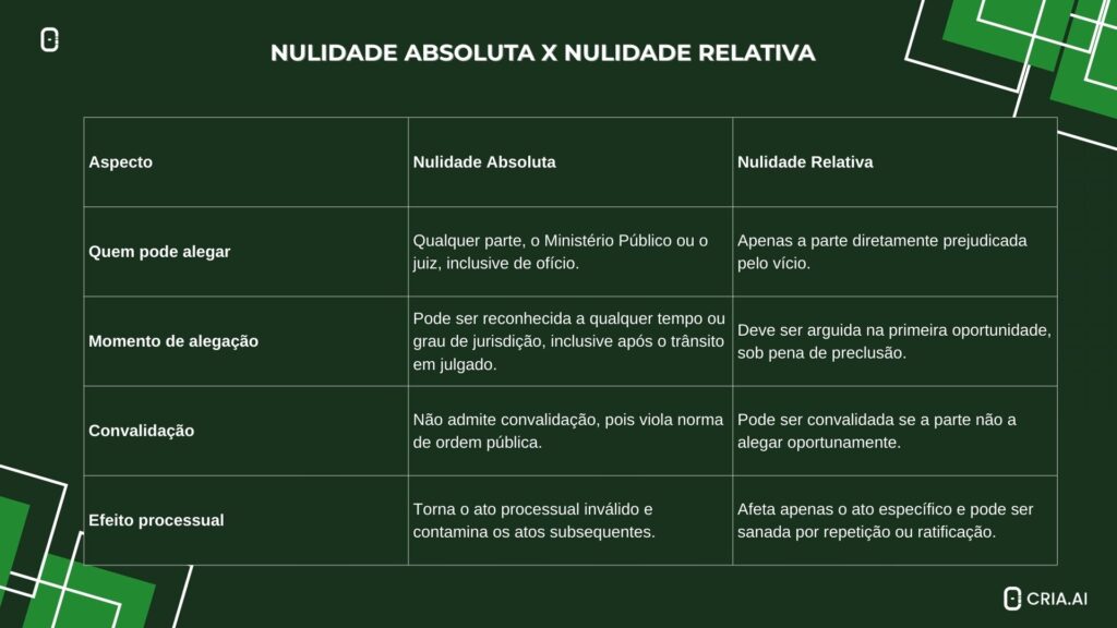 Para facilitar a visualização prática das diferenças, a seguir há uma tabela comparando as nulidades absolutas e relativas quanto aos principais aspectos processuais.