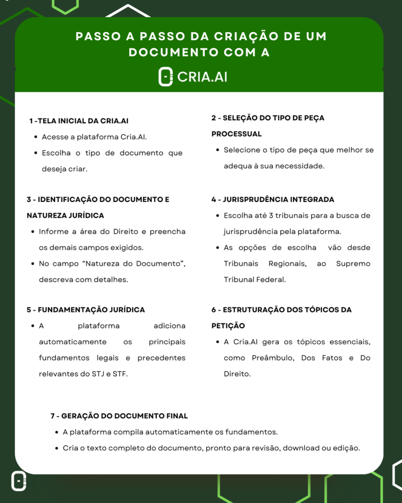 Esses modelos, adaptados e automatizados na Cria.AI, permitem que o advogado gere petições completas com base nas informações do cliente, mantendo precisão técnica e linguagem jurídica adequada.