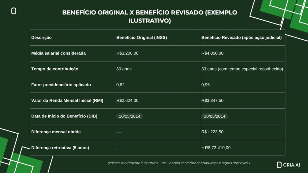 Para ilustrar na prática o impacto financeiro que uma revisão de aposentadoria bem fundamentada pode gerar, veja a tabela comparativa abaixo entre o benefício original e o benefício revisado.