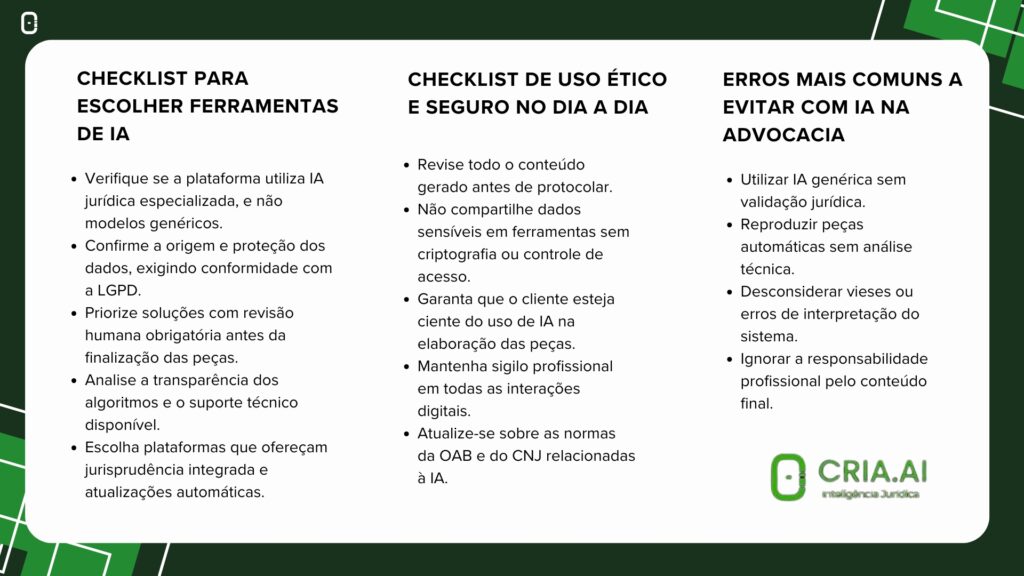 Por outro lado, o documento reconhece o valor da IA especializada, como a Cria.AI, que opera dentro dos limites éticos e jurídicos da profissão. Assim, o uso consciente da tecnologia torna-se compatível com as normas de conduta da advocacia.