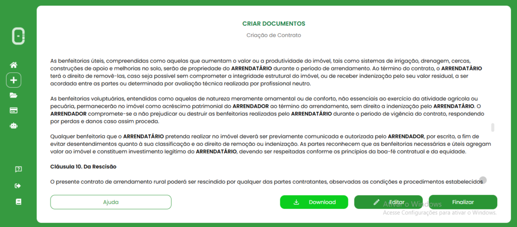 Essa funcionalidade elimina etapas manuais e reduz o tempo de elaboração sem comprometer a qualidade técnica do Contrato de Arrendamento Rural.