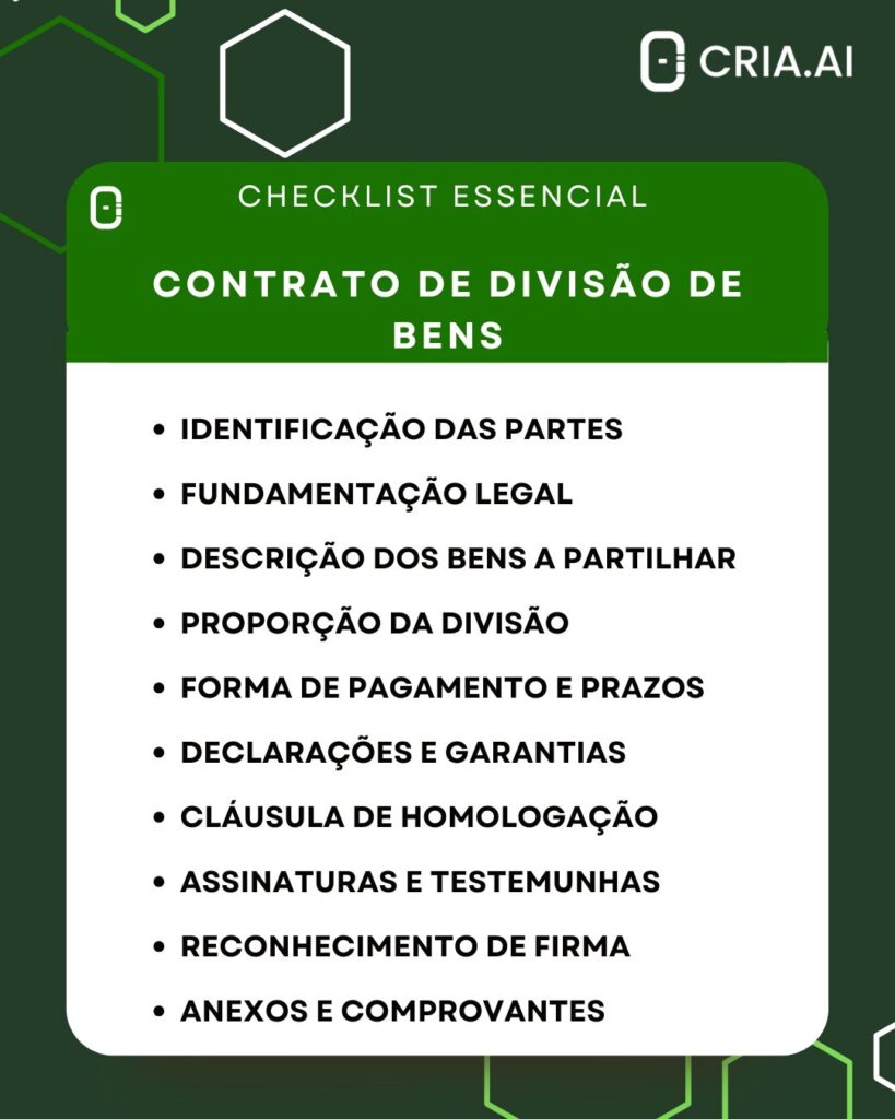 Elaborar um contrato de divisão de bens exige atenção aos detalhes. Um checklist funcional ajuda o advogado a revisar o documento com precisão antes da assinatura.