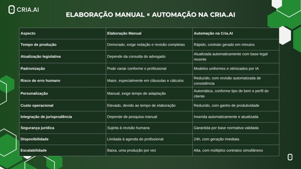 Confira abaixo, uma tabela comparativa entre uma elaboração de documentos de forma manual e com a Cria.AI: