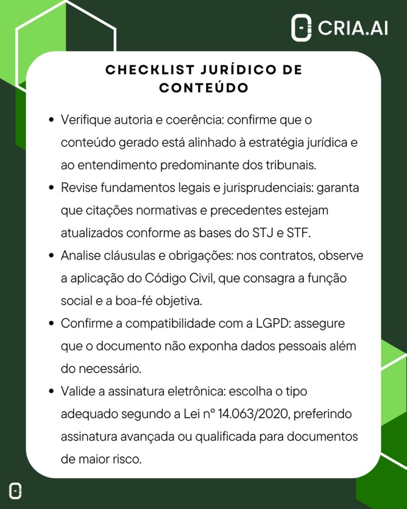 A seguir, um checklist prático que auxilia o profissional a manter conformidade técnica, probatória e ética no uso de IA jurídica.