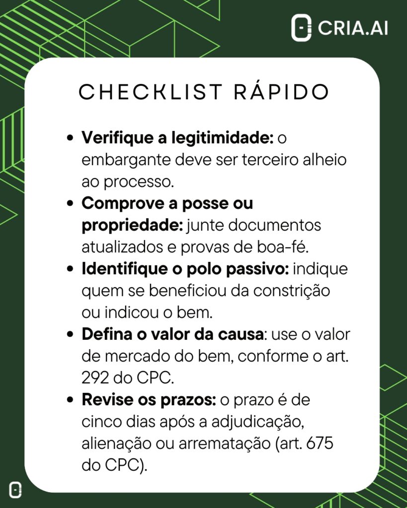 Outro erro recorrente é não demonstrar a qualidade de terceiro. O advogado deve deixar claro, logo na introdução da petição, que o embargante não é parte da ação principal. A ausência dessa informação compromete a admissibilidade.