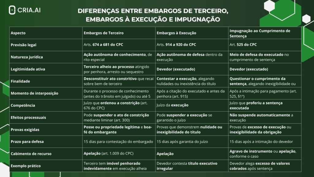 Por fim, os efeitos também divergem. Enquanto os embargos de terceiro suspendem a constrição sobre o bem, a impugnação pode suspender a execução como um todo, conforme o caso.
