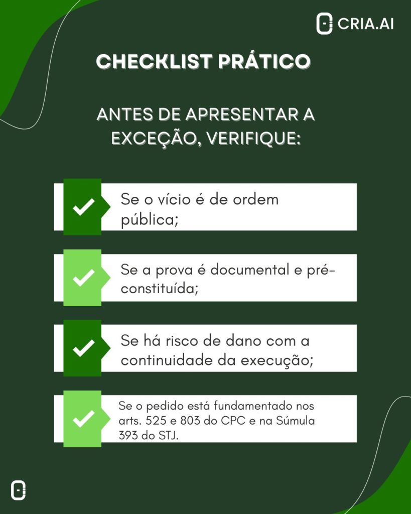 Com isso, o uso da exceção garante celeridade processual, evita penhoras indevidas e assegura que o processo siga apenas se estiver formalmente correto.