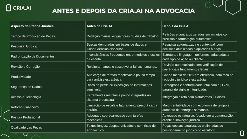 Para visualizar com clareza o impacto real da tecnologia, veja abaixo como a rotina jurídica mudou com a chegada da Cria.AI.