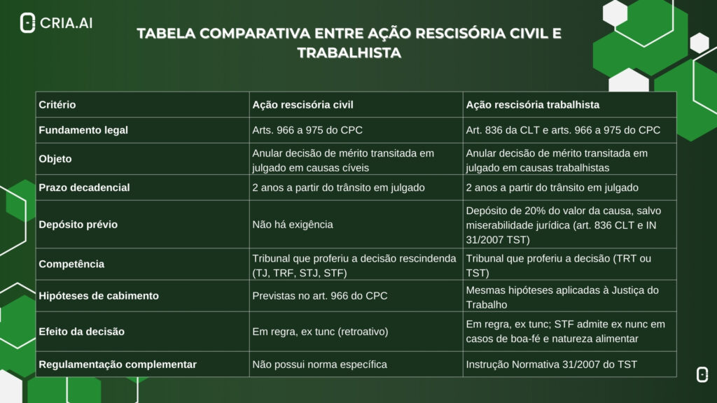 Nesse contexto, para compreender melhor as diferenças estruturais entre o regime comum e o trabalhista, veja a tabela comparativa a seguir, que destaca os principais aspectos da ação rescisória em cada esfera.