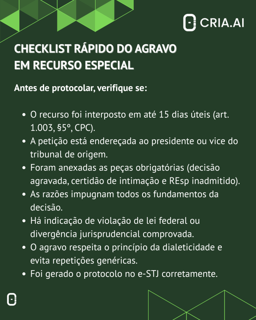 Evitar esses deslizes, assegura o conhecimento do agravo e aumenta as chances de êxito no STJ, por isso segue um checklist visual para salvar:
