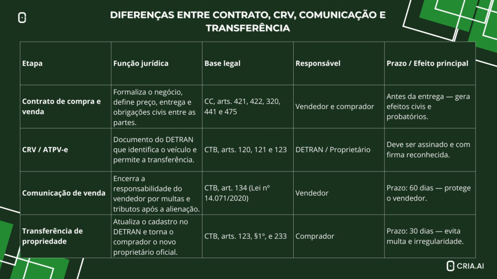 Para compreender como cada etapa se relaciona e quais responsabilidades envolvem vendedor e comprador, veja o quadro comparativo a seguir entre o contrato, o CRV, a comunicação de venda e a transferência de propriedade.