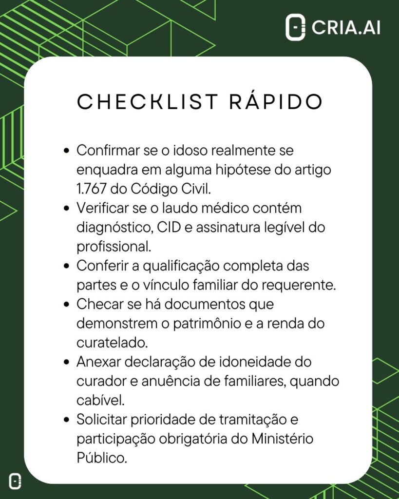 Cumprir esse checklist evita retrabalho e indeferimentos. Assim, o processo se torna mais rápido, eficiente e alinhado aos princípios da proteção integral e da dignidade da pessoa idosa.