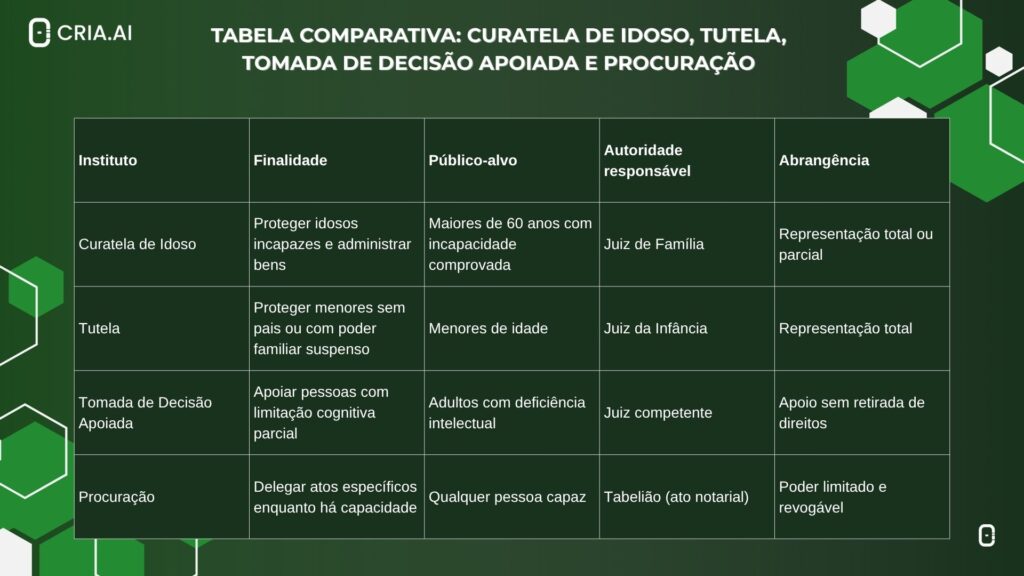 - Comparativo rápido: Curatela de Idoso vs Outros Institutos