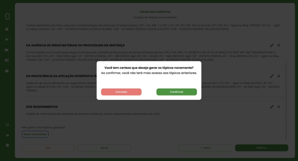 10. Se você não gostou dos fundamentos apresentados, pode utilizar o botão ao final da página “Gerar novamente”. Ao confirmar, a IA vai refazer a busca e apresentar novas sugestões.