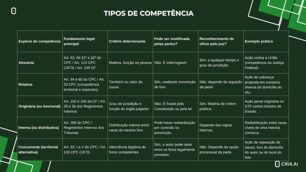 Nesse contexto, compreender as espécies de competência é essencial para identificar corretamente quando cabe a exceção de incompetência relativa.