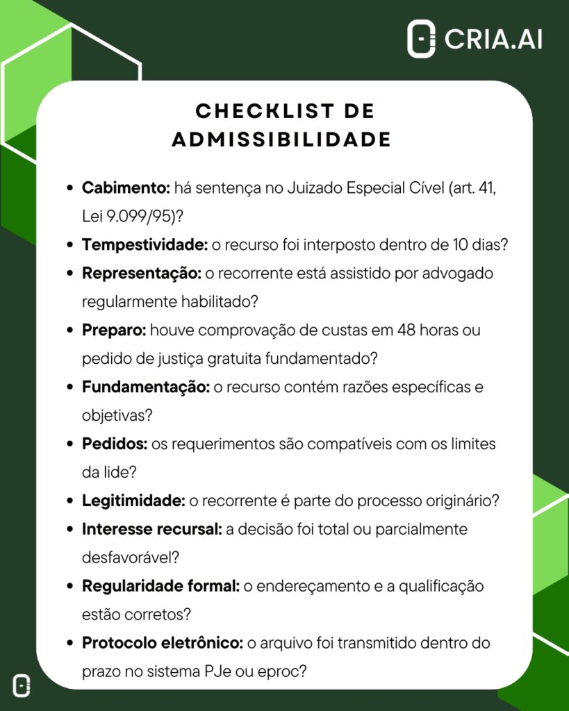 A admissibilidade é o filtro técnico do recurso inominado. O advogado deve observar rigorosamente os prazos e requisitos previstos em lei, sob pena de deserção ou intempestividade.