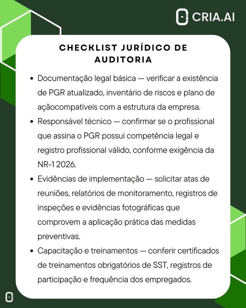Em auditorias internas ou externas, o cumprimento da NR 1 depende de documentação técnica e comprovação prática.