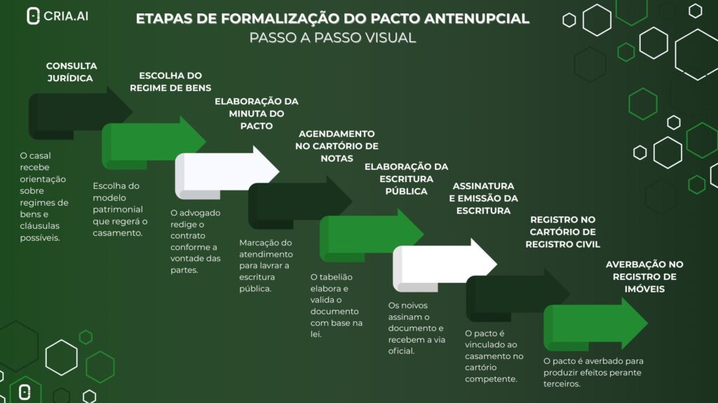 Em primeiro lugar, o pacto deve ser formalizado por escritura pública em Cartório de Notas, conforme o artigo 1.653 do Código Civil. Em seguida, é indispensável o registro no Cartório de Registro Civil, onde ocorrerá o casamento.