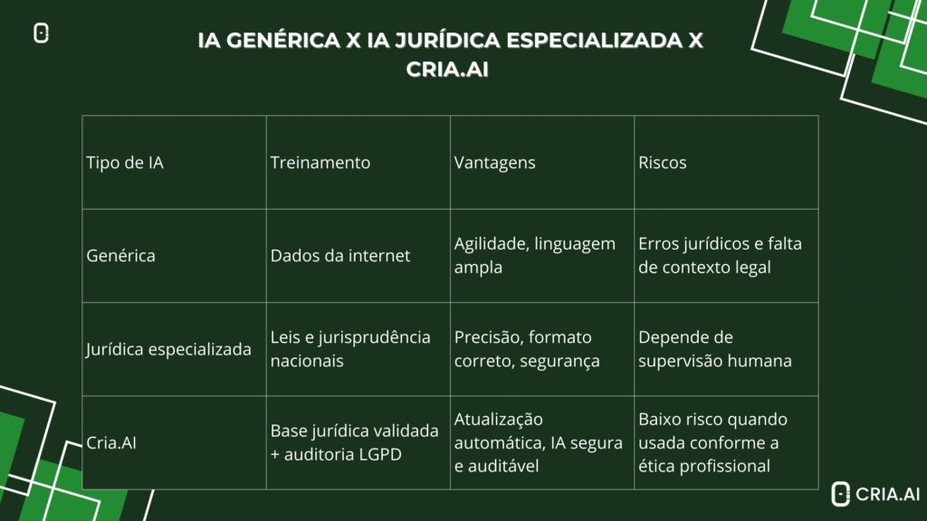 - IA genérica x IA jurídica especializada x Cria.AI (tabela comparativa)