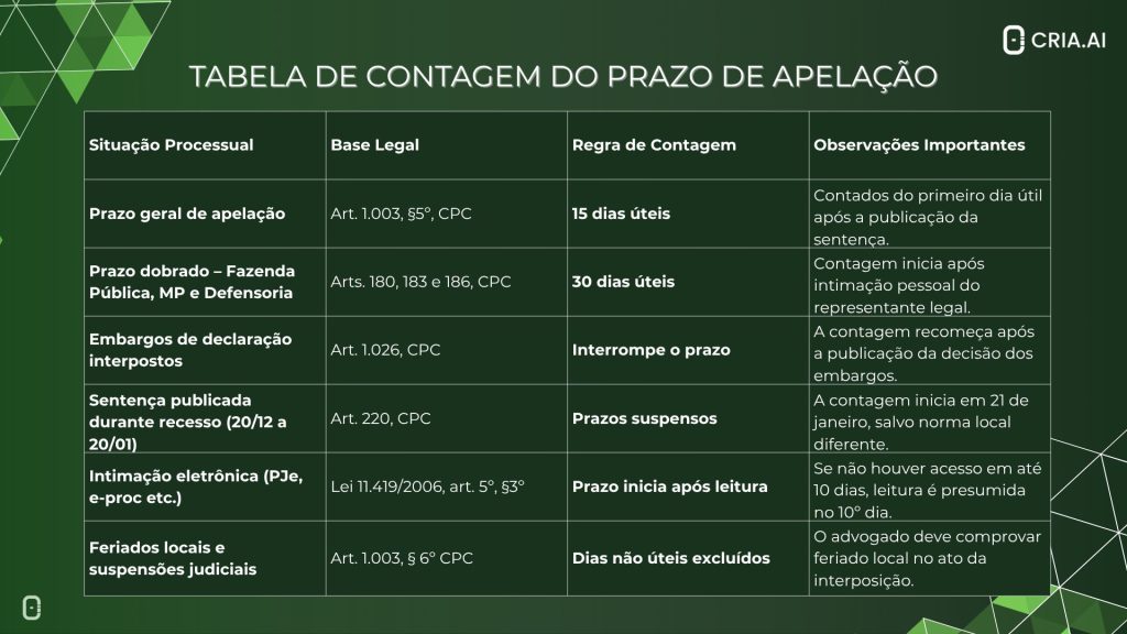 A contagem do prazo de apelação no CPC, depende do modo como a intimação foi realizada. Nos processos eletrônicos, o prazo começa a correr no primeiro dia útil após a consulta ao processo eletrônico, conforme o art. 5º, §3º, da Lei 11.419/2006.