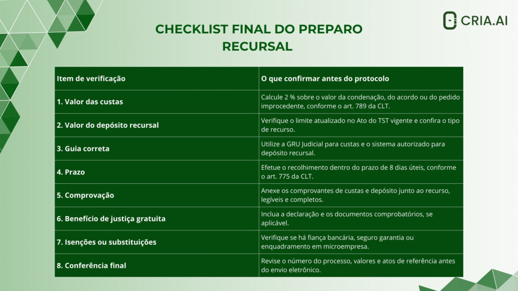 Seguir esse checklist reduz drasticamente o risco de deserção e assegura confiabilidade no preparo recursal.