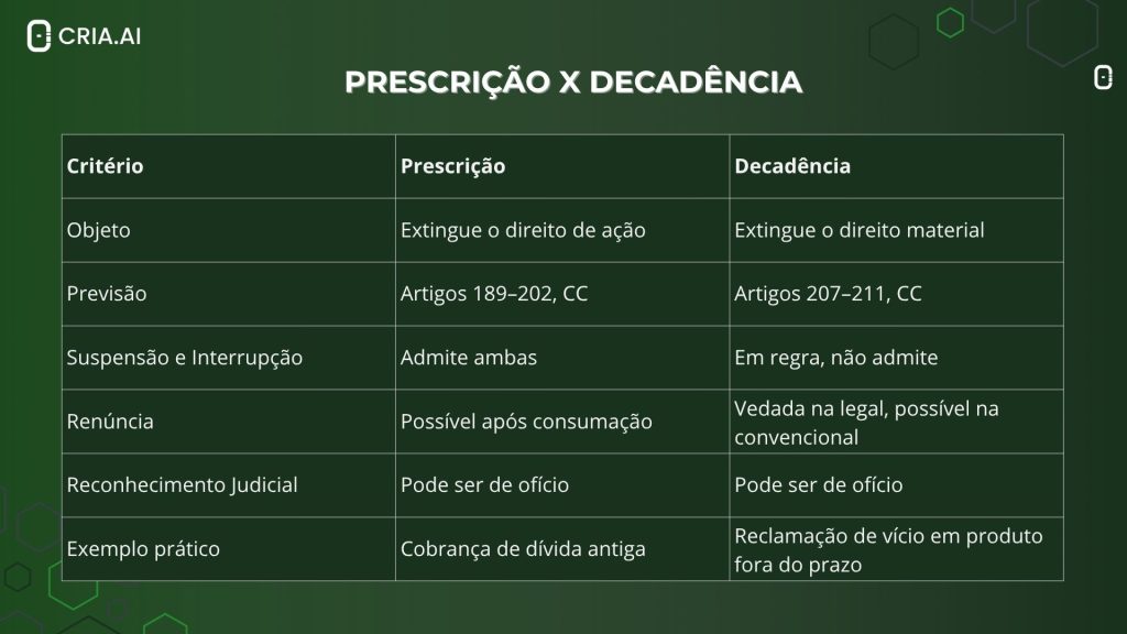 Logo, dominar as diferenças entre prescrição e decadência não é apenas um requisito técnico, mas uma estratégia de atuação jurídica eficaz.