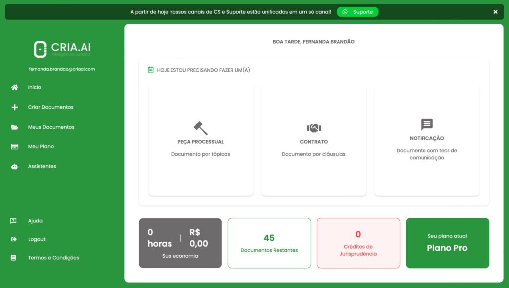 A Cria.AI facilita o trabalho do advogado ao automatizar o cálculo de prazos, gerar peças com fundamentação atualizada e sugerir argumentos de acordo com o caso concreto.