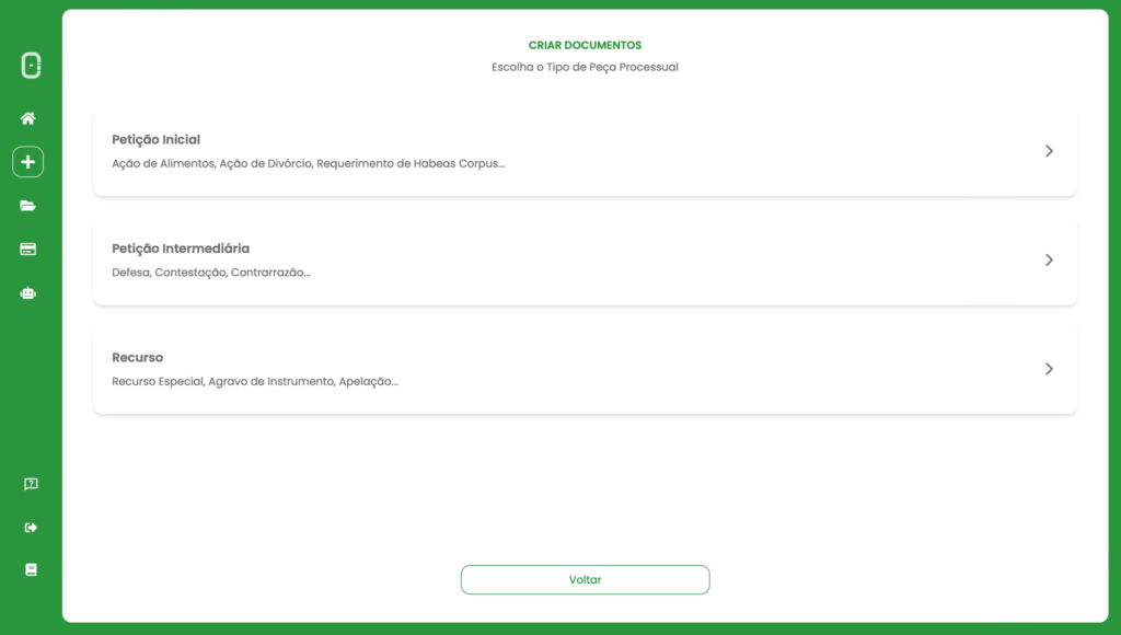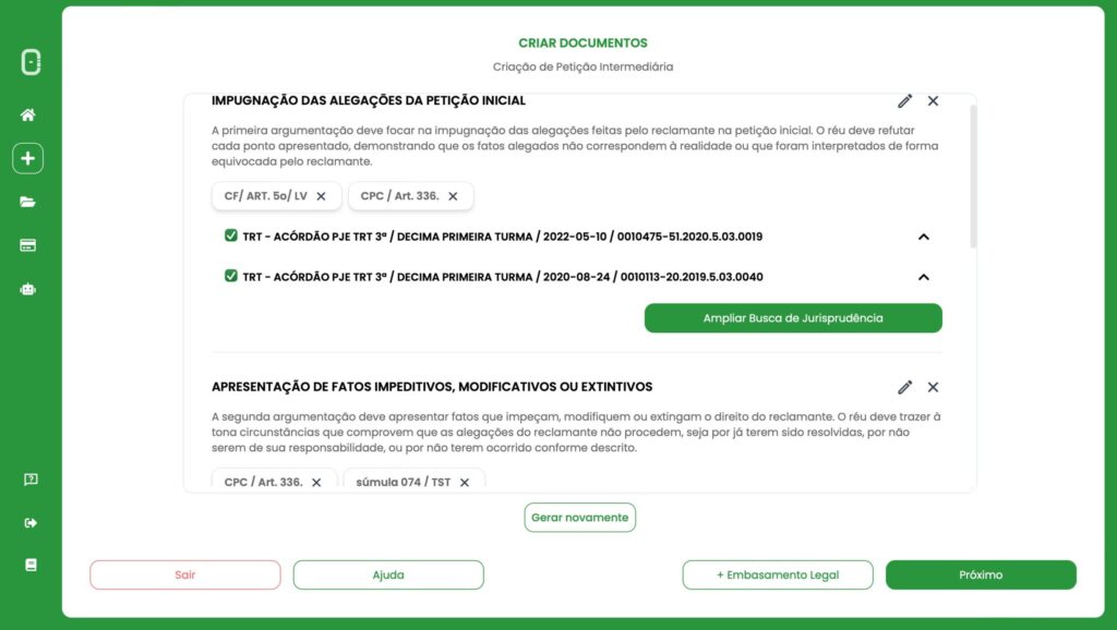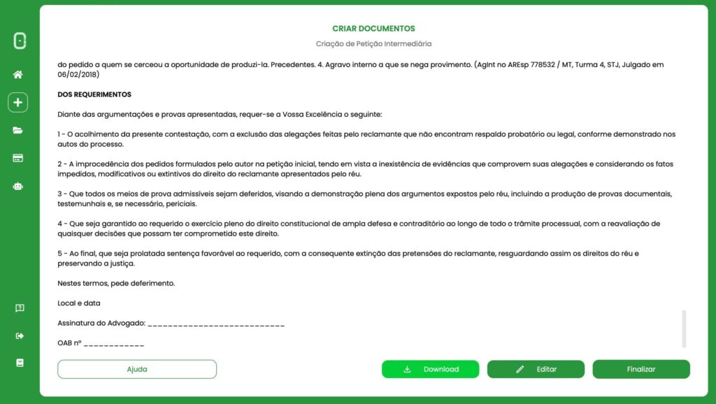 A plataforma compila todos os fundamentos e cria o texto completo do documento, pronto para revisão, download ou edição personalizada antes do protocolo.