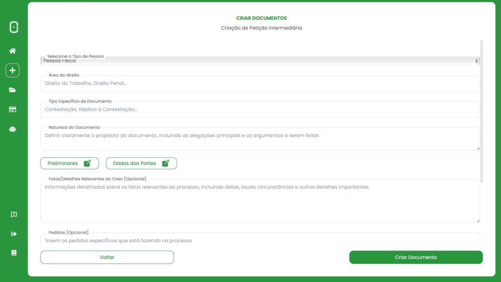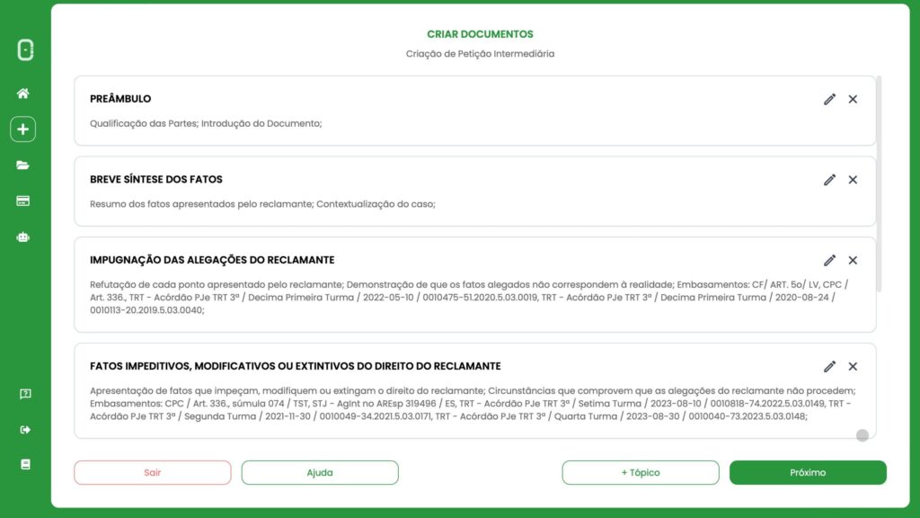 A Cria.AI gera automaticamente os tópicos essenciais como, Preâmbulo, Dos Fatos e Do Direito, com embasamento jurídico e jurisprudencial atualizados.