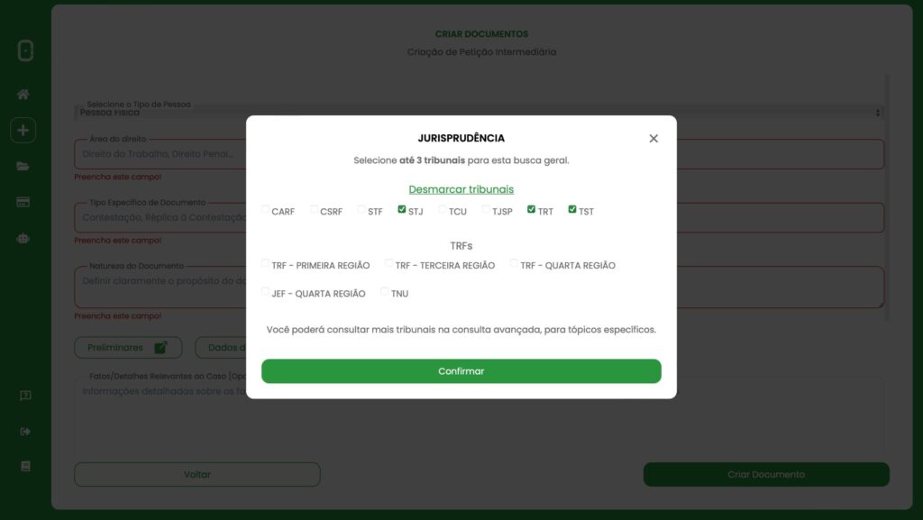 Escolha até três tribunais para que a Cria.AI realize a busca automática de jurisprudências pertinentes ao caso.