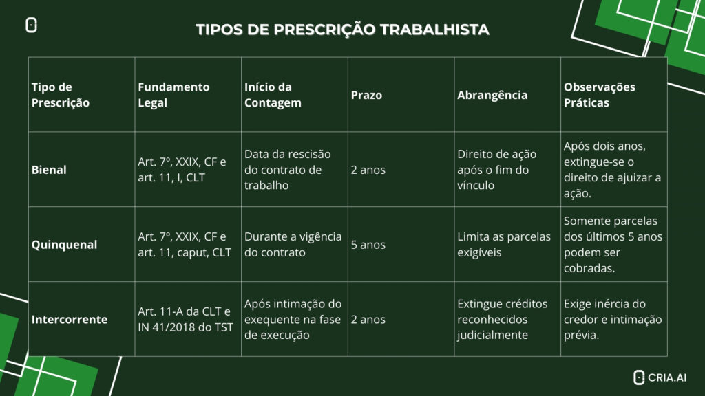 - Tipos de prescrição trabalhista: bienal, quinquenal e intercorrente