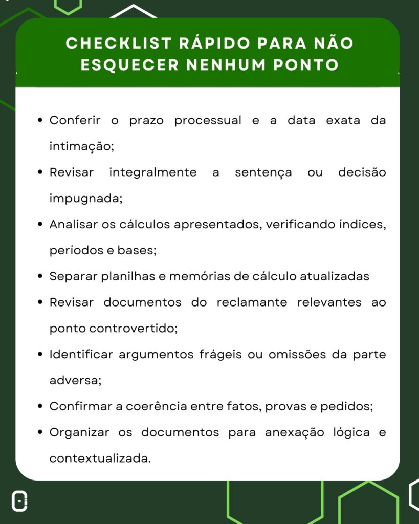 A revisão técnica constitui etapa indispensável da Impugnação Trabalhista. Nesse sentido, a conferência dos dados processuais evita erros formais que comprometem a validade do ato.